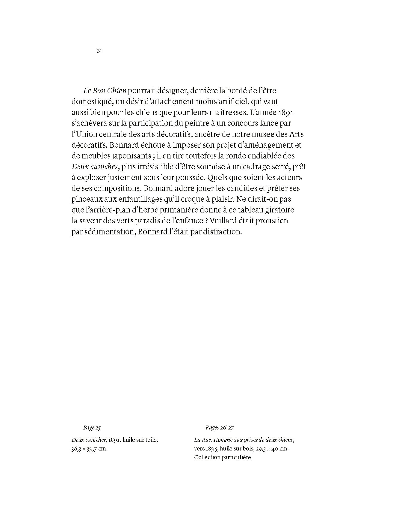 Pierre Bonnard et ses chiens offre un regard nouveau sur l’œuvre du peintre, souvent associé au chat, à travers la dominante canine qui s’y manifeste. Présents dans ses photographies, ses dessins et ses peintures, les chiens font communiquer vie privée et création artistique de mille façons. S’appuyant sur diverses sources, Stéphane Guégan montre comment ces indispensables compagnons et confidents ont contribué à façonner la vision plastique et poétique de Bonnard : ils bousculent l’échelle de ses compositions, troublent la perspective et apportent mouvement, tendresse et réflexion morale.